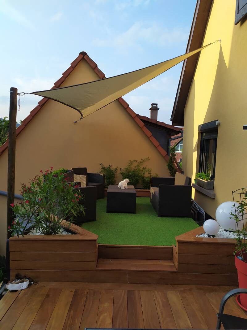 Avant: ancienne terrasse Après: auto-rénovation de la terrasse sur deux niveaux